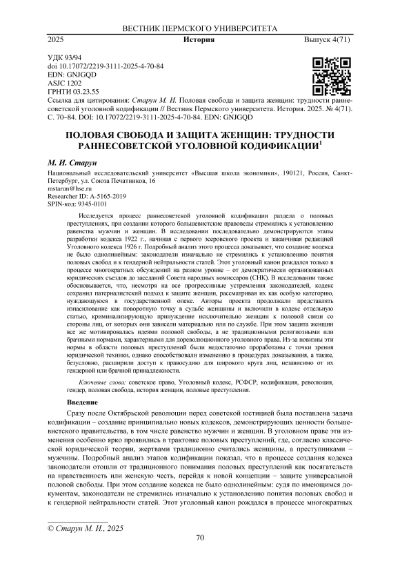 Исследуется процесс раннесоветской уголовной кодификации раздела о половых преступлениях, при создании которого большевистские правоведы стремились к установлению равенства мужчин и женщин. В исследовании последовательно демонстрируются этапы разработки кодекса 1922 г., начиная с первого эсеровского проекта и заканчивая редакцией Уголовного кодекса 1926 г. Подробный анализ этого процесса доказывает, что создание кодекса не было однолинейным: законодатели изначально не стремились к установлению понятия половых свобод и к гендерной нейтральности статей. Этот уголовный канон рождался только в процессе многократных обсуждений на разном уровне – от демократически организованных юридических съездов до заседаний Совета народных комиссаров (СНК). В исследовании также обосновывается, что, несмотря на все прогрессивные устремления законодателей, кодекс сохранил патерналистский подход к защите женщин, рассматривая их как особую категорию, нуждающуюся в государственной опеке. Авторы проекта продолжали представлять изнасилование как поворотную точку в судьбе женщины и включили в кодекс отдельную статью, криминализирующую принуждение исключительно женщин к половой связи со стороны лиц, от которых они зависели материально или по службе. При этом защита женщин все же мотивировалась идеями половой свободы, а не традиционными религиозными или брачными нормами, характерными для дореволюционного уголовного права. Из-за новизны эти нормы в области половых преступлений были недостаточно проработаны с точки зрения юридической техники, однако способствовали изменению в процедурах доказывания, а также, безусловно, расширили доступ к правосудию для широкого круга лиц, независимо от их гендерной или брачной принадлежности.