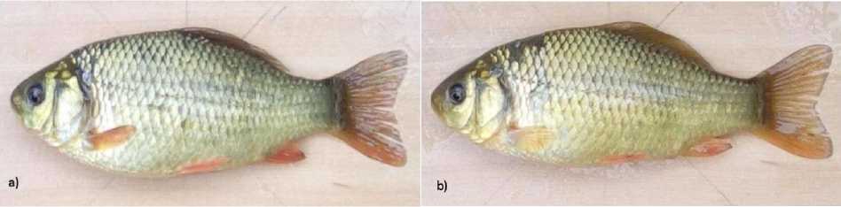 Fig. 1. Carassius carassius specimens from Lake Srednee, a) female (l = 10.5 cm, m = 38 g); b) male (l = 11.9 cm, m = 42 g)