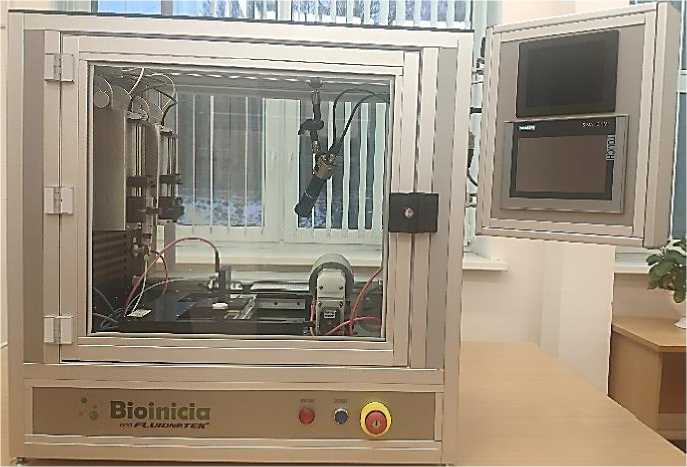 Процесс электроформования нановолокнистого слоя осуществлялся на установке Fluidnatek LE-50 (рисунок 1). Для получения разрабатываемого материала была использована подложка из пергаментной сили-конизированной бумаги. Данный вид подложки не затрудняет протекание процесса электроформования и, благодаря низкой адгезии, обеспечивает снятие пленки без повреждений.
