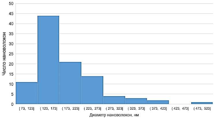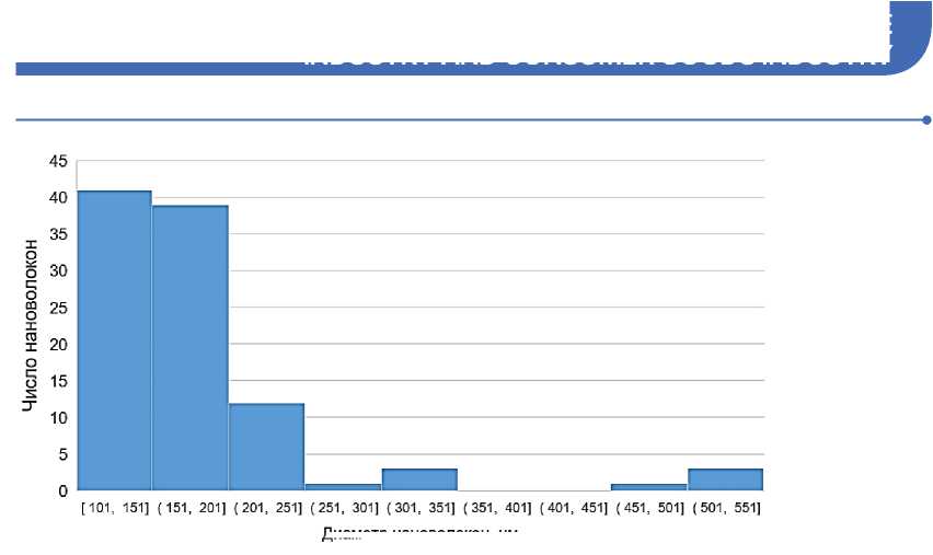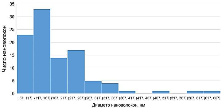 Определение среднего диаметра получаемых волокон и их неравномерности по толщине осуществлялось на основе измерений 100 волокон образца по изображениям, полученным при увеличении в 10000 раз. Гистограммы распределения волокон по диаметру представлены на рисунке 3. Результаты статистической обработки полученные при измерениях данных представлены в таблице 2. Можно отметить не-