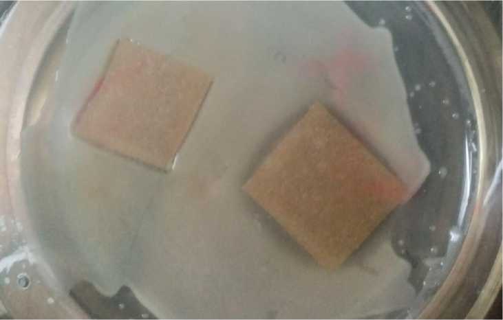 Белый фон в чашке Петри представляет собой сплошную зону роста бактерии. На этом фоне хорошо видна чистая зона вокруг образцов, что свидетельствует о высвобождении антибактериального компонента и его действии на микроорганизм (Шеряков, 2008). Установлено, что средняя величина зоны задержки роста вокруг нановолокнистого материала для образца № 2 составляет 1,6 мм ( n = 3). Для образца № 3 зона задерж-