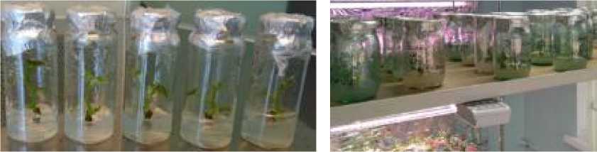 Введенные меристемы разместили в культуральную комнату, где поддерживались следующие условия: освещенность в диапазоне 2000– 3000 люкс, температура от 25 до 28 °C и влажность воздуха в пределах 70–75 %. На вариант опыта высаживали по 30 шт. меристем.