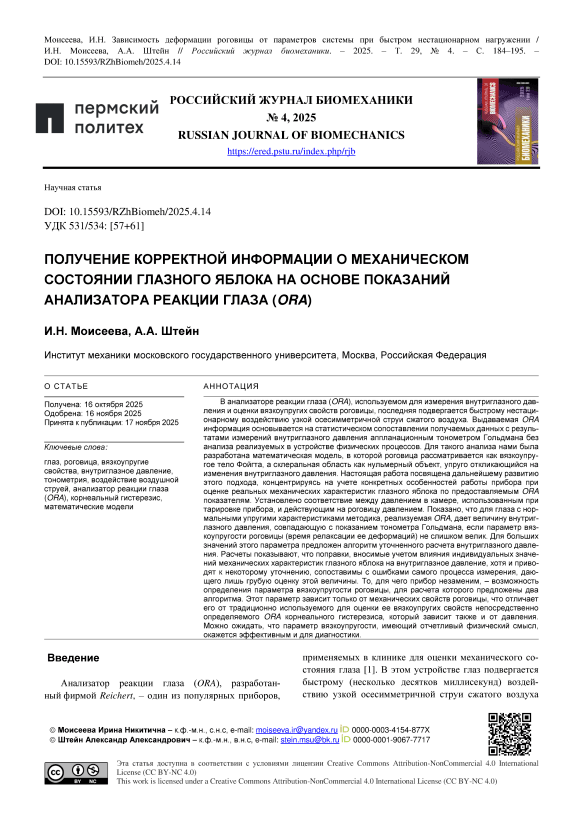 В анализаторе реакции глаза (ORA), используемом для измерения внутриглазного дав-ления и оценки вязкоупругих свойств роговицы, последняя подвергается быстрому нестационарному воздействию узкой осесимметричной струи сжатого воздуха. Выдаваемая ORA информация основывается на статистическом сопоставлении получаемых данных с результатами измерений внутриглазного давления аппланационным тонометром Гольдмана без анализа реализуемых в устройстве физических процессов. Для такого анализа нами была разработана математическая модель, в которой роговица рассматривается как вязкоупругое тело Фойгта, а склеральная область как нульмерный объект, упруго откликающийся на изменения внутриглазного давления. Настоящая работа посвящена дальнейшему развитию этого подхода, концентрируясь на учете конкретных особенностей работы прибора при оценке реальных механических характеристик глазного яблока по предоставляемым ORA показателям. Установлено соответствие между давлением в камере, использованным при тарировке прибора, и действующим на роговицу давлением. Показано, что для глаза с нормальными упругими характеристиками методика, реализуемая ORA, дает величину внутриглазного давления, совпадающую с показанием тонометра Гольдмана, если параметр вязкоупругости роговицы (время релаксации ее деформаций) не слишком велик. Для больших значений этого параметра предложен алгоритм уточненного расчета внутриглазного давления. Расчеты показывают, что поправки, вносимые учетом влияния индивидуальных значений механических характеристик глазного яблока на внутриглазное давление, хотя и приводят к некоторому уточнению, сопоставимы с ошибками самого процесса измерения, дающего лишь грубую оценку этой величины. То, для чего прибор незаменим, – возможность определения параметра вязкоупругости роговицы, для расчета которого предложены два алгоритма. Этот параметр зависит только от механических свойств роговицы, что отличает его от традиционно используемого для оценки ее вязкоупругих свойств непосредственно определяемого ORA корнеального гистерезиса, который зависит также и от давления. Можно ожидать, что параметр вязкоупругости, имеющий отчетливый физический смысл, окажется эффективным и для диагностики.