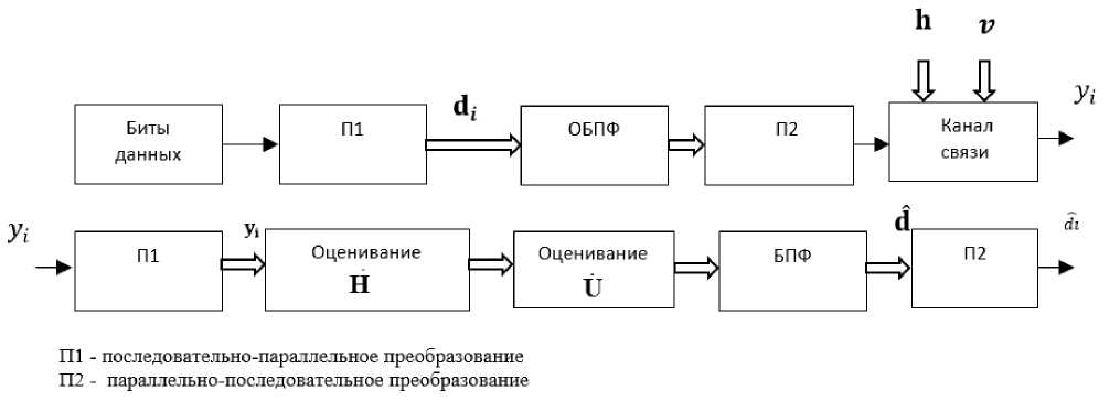 На рисунке 1 показана схема рассматриваемой OFDM-системы. Исходный поток данных разбивается на последовательность OFDM-блоков (символов), где d im , m = 0,1,..., N - 1 - это информационные символы i -го блока, а N – количество поднесущих в символе OFDM.