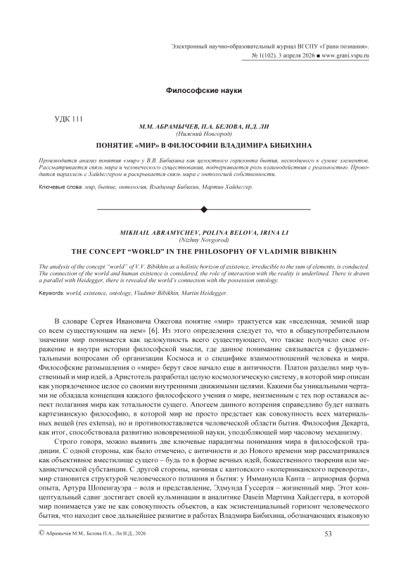 The analysis of the concept “world” of V.V. Bibikhin as a holistic horizon of existence, irreducible to the sum of elements, is conducted. The connection of the world and human existence is considered, the role of interaction with the reality is underlined. There is drawn a parallel with Heidegger, there is revealed the world’s connection with the possession ontology.