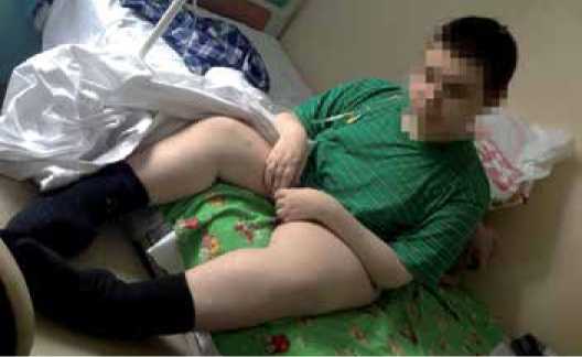 При осмотре пациента Н. состояние тяжёлое, заторможен, на вопросы отвечает медленно, положение – ортопноэ (рис. 2). Лицо обращено вниз, мимика вялая, акроцианоз. Сколиоз грудного отдела позвоночника. Мышцы бедра плохо развиты, икроножные – несколько увеличены в размерах. Голени, лодыжки и ступни уменьшены в размерах и повёрнуты внутрь, симметричная отёчность голеней и стоп. Руки слабые, вялые, пальцы прижаты к друг другу в неполный кулак. Частота дыхательных движений (ЧДД) 24 в минуту, пульс 110 ударов в минуту, артериальное давление (АД) 140/100 мм рт. ст., сатурация кислорода (SpO 2 ) 97% -днём, 95% – ночью. Тоны сердца ритмичные, глухие. В лёгких дыхание жёсткое, справа не проводится ниже 5-го, слева – ослабленное, в нижних отделах выслушиваются мелко- и среднепузырчатые влажные хрипы. Живот безболезненный, передняя брюшная стенка при пальпации пастозная, печень пальпируется на 1 см ниже правой рёберной дуги, олигурия.