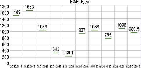 4,19 ммоль/л, аланинаминотрансфераза – 268 Ед/л, аспартатаминотрансфераза – 93Ед/л. Динамика КФК (норма 20-200 Eд/л) приведена на рисунке 5.