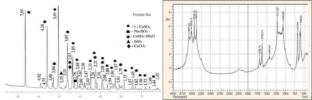 Ренгенофазовый анализ (рис. 2 а) и ИК-спектральный анализ (рис. 2 б) продуктов гидратации при активизации фторангидрита фосфатом натрия показали формирование двуводного сульфата кальция.