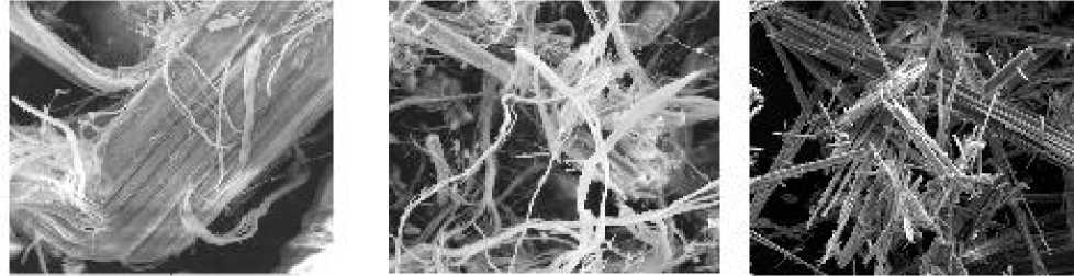Рисунок 3 – Структура волокон асбеста: (а) общий вид асбестового волокна марки 7-350, увеличение ×6500, (б) хризотил-асбест (из группы серпентинов) в минеральной матрице, увеличение ×6800, (в) волокна амфибол-асбеста, увеличение ×6200