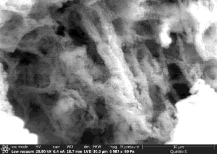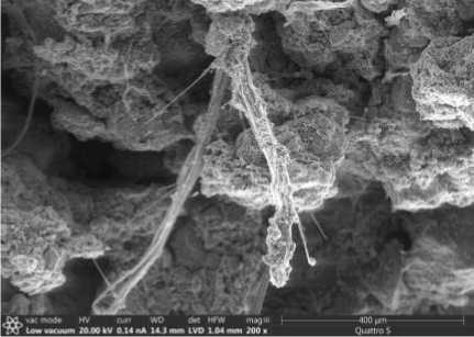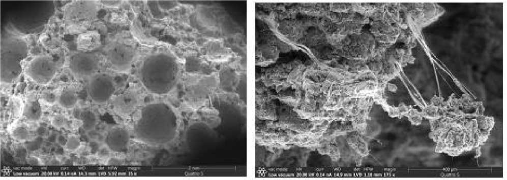 Хризотил-асбестовое волокно в силу высокой дисперсности равномерно распределяется в межпоровых перегородках стабилизируя пористую структуру композиции (рис. 4 а), имеет хорошее сцепление с вяжущей матрицей (рис. 4 б, 5 а). Отмечается вторичная кристаллизация новообразований в порах на поверхности асбестовых волокон (рис. 5 б) в процессе гидратации фторангидрита. Новообразования на основе двуводного гипса обеспечивают дополнительное сцепление с хризотил-асбестовым волокном, обеспечивая прирост прочности и стабилизацию структуры композиционного материала.