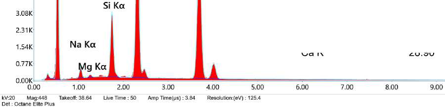 Рисунок 6 – Энергодисперсионный рентгеновский микроанализ поверхности асбестового волокна, покрытого фторангидритовой матрицей