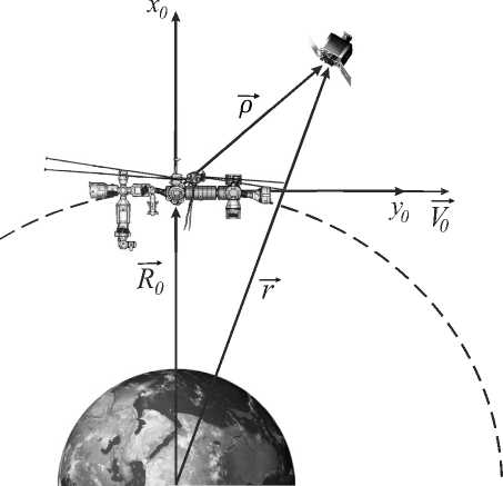 Примем МКС и СИ за материальные точки, вращающиеся вокруг Земли по орбитам радиуса R 0 и r соответственно. При этом расстояние между ними будет считаться намного меньше радиуса орбиты станции р<< R 0 [4]. Движение инспектора будем рассматривать в подвижной орбитальной системе координат (ОСК), начало отсчета которой поместим в центре масс МКС (рисунок 1).