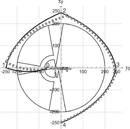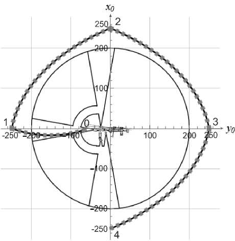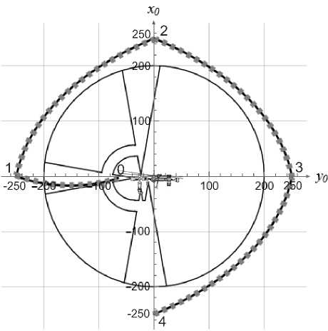 Учитывая требования, установленные в Спецификации Российского сегмента (РС) МКС на движение КА в окрестности МКС, определим зону безопасного облета МКС для СИ за пределами окружности радиуса 200 м, проведенной из центра ОСК. Так как на РС МКС находятся четыре узла для стыковки космических кораблей, то движение СИ внутри установленной окружности разрешено в четырех конусах с углом полураствора 10° относительно оси каждого стыковочного узла и в полукольце, проведенном из выбранного узла стыковки. Меньший радиус полукольца составляет 40 м, а больший – 60 м (рисунок 2) [5].