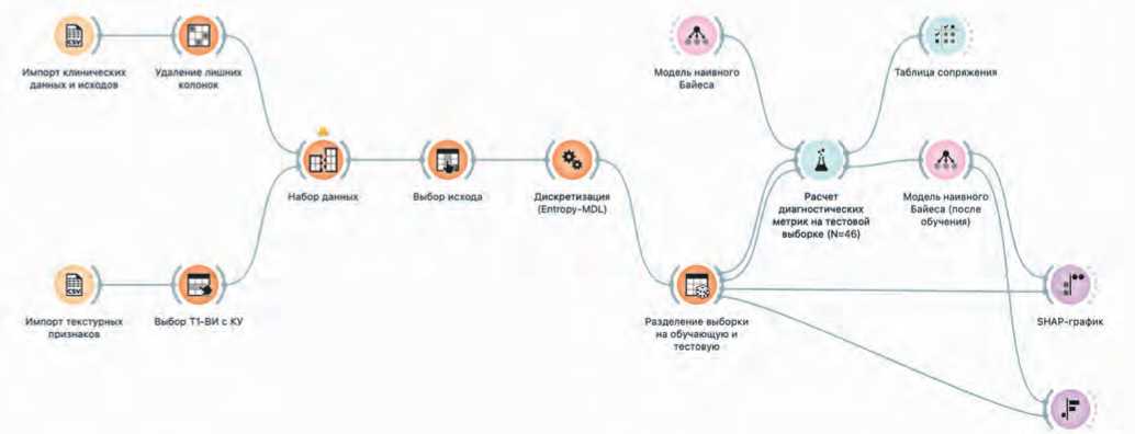 Анализ данных выполнен в RStudio версии 4.1.2 [9], Jamovi версии 2.6.24 и Orange версии 3.37. В качестве порогового уровня статистической значимости было принято значение 0,05 (одностороннее). Вся последовательность построения модели представлена на рисунке 1 в виде схемы взаимодействия виджетов в интерфейсе Orange.