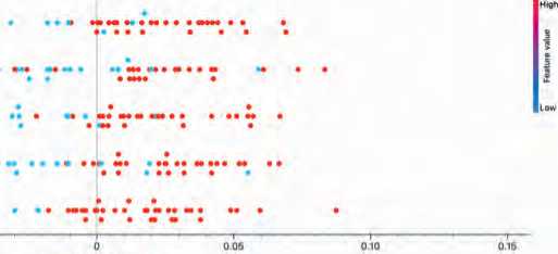 shape_VoxelVolume (Признаки формы_Воксельный объем), original_glrlm_RunLengthNonUniformity (Матрица длин серий уровней серого_Неравномерность длины ряда), original_shape_LeastAxisLength (Признаки формы_Наименьшая длина оси) и original_shape_ Maximum2DDiameterColumn (Признаки формы_Мак-симальный 2D диаметр, колонка). Для большинства перечисленных признаков высокие значения (красные точки) смещают предсказание модели вправо, увеличивая вероятность целевого класса, тогда как низкие значения (синие точки) – влево, уменьшая ее. Именно характеристики формы образования (4 из 5 признаков) и показатели его неоднородности являются ключевыми детерминантами решения модели, причем большие размеры и выраженная неоднородность чаще ассоциированы с повышенной вероятностью целевого класса.