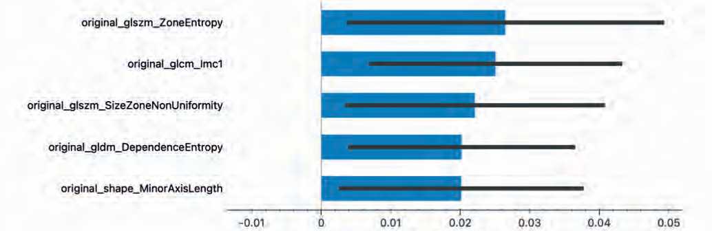 Также был получен график Feature Importance, на котором представлены Топ-5 радиомических признаков по степени влияния на AUC классификационной модели: