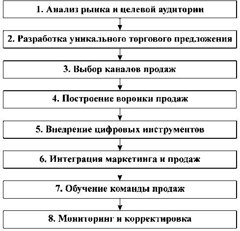 Построение системы продаж в ИТ-компании предлагается разбить на восемь этапов (см. Рисунок 1):