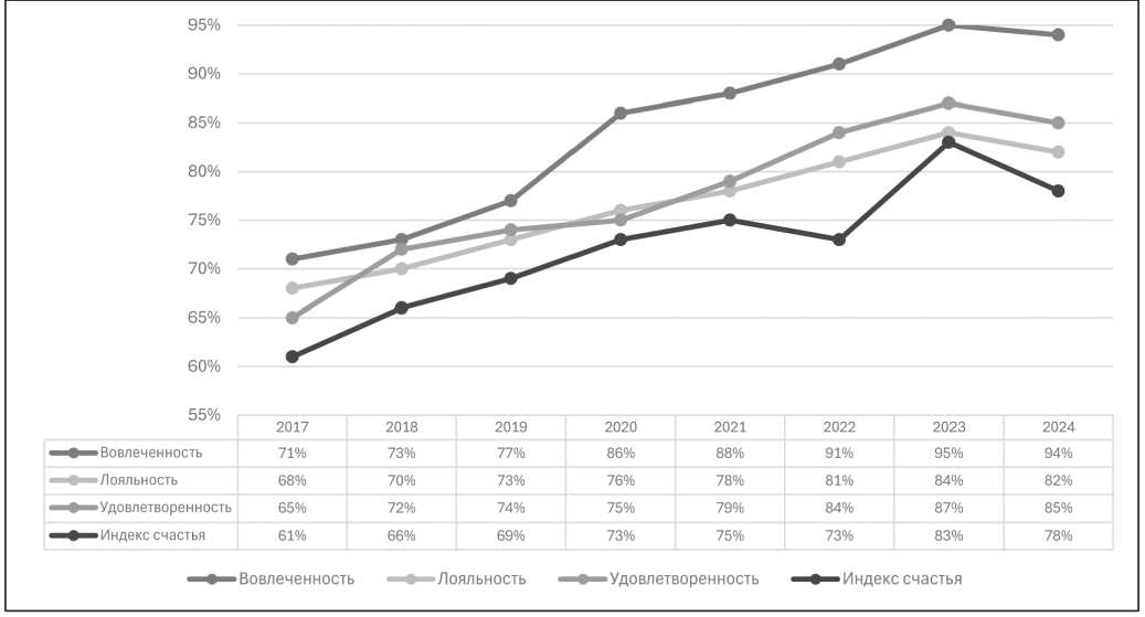 Рисунок 5. Показатели вовлеченности, лояльности, удовлетворенности и индекса счастья сотрудников департамента корпоративных продаж в 2017-2024 годах