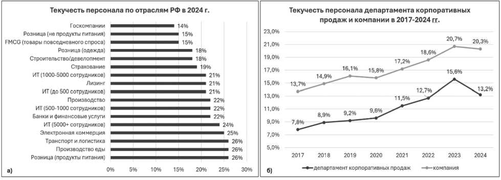 Рисунок 6. Текучесть персонала по отраслям РФ в 2024 году (а), департамента корпоративных продаж и ИТ-компании в 2017-2024 годах (б)