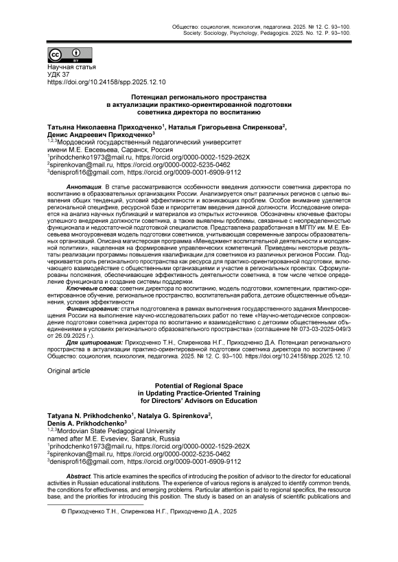 В статье рассматриваются особенности введения должности советника директора по воспитанию в образовательных организациях России. Анализируется опыт различных регионов с целью выявления общих тенденций, условий эффективности и возникающих проблем. Особое внимание уделяется региональной специфике, ресурсной базе и приоритетам введения данной должности. Исследование опирается на анализ научных публикаций и материалов из открытых источников. Обозначены ключевые факторы успешного внедрения должности советника, а также выявлены проблемы, связанные с неопределенностью функционала и недостаточной подготовкой специалистов. Представлена разработанная в МГПУ им. М.Е. Евсевьева многоуровневая модель подготовки советников, учитывающая современные запросы образовательных организаций. Описана магистерская программа «Менеджмент воспитательной деятельности и молодежной политики», нацеленная на формирование управленческих компетенций. Приведены некоторые результаты реализации программы повышения квалификации для советников из различных регионов России. Подчеркивается роль регионального пространства как ресурса для практико-ориентированной подготовки, включающего взаимодействие с общественными организациями и участие в региональных проектах. Сформулированы положения, обеспечивающие эффективность деятельности советника, в том числе четкое определение функционала и создание системы поддержки.