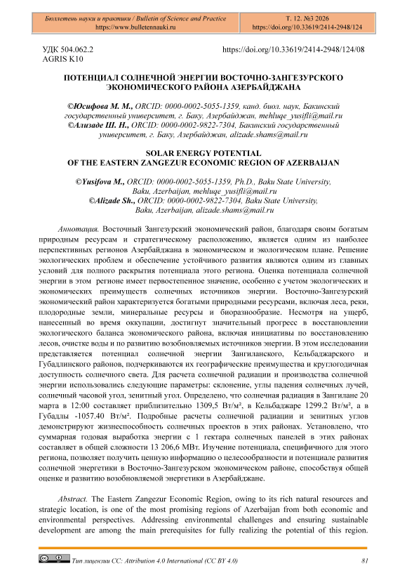 Восточный Зангезурский экономический район, благодаря своим богатым природным ресурсам и стратегическому расположению, является одним из наиболее перспективных регионов Азербайджана в экономическом и экологическом плане. Решение экологических проблем и обеспечение устойчивого развития являются одним из главных условий для полного раскрытия потенциала этого региона. Оценка потенциала солнечной энергии в этом регионе имеет первостепенное значение, особенно с учетом экологических и экономических преимуществ солнечных источников энергии. Восточно-Зангезурский экономический район характеризуется богатыми природными ресурсами, включая леса, реки, плодородные земли, минеральные ресурсы и биоразнообразие. Несмотря на ущерб, нанесенный во время оккупации, достигнут значительный прогресс в восстановлении экологического баланса экономического района, включая инициативы по восстановлению лесов, очистке воды и по развитию возобновляемых источников энергии. В этом исследовании представляется потенциал солнечной энергии Зангиланского, Кельбаджарского и Губадлинского районов, подчеркиваются их географические преимущества и круглогодичная доступность солнечного света. Для расчета солнечной радиации и производства солнечной энергии использовались следующие параметры: склонение, углы падения солнечных лучей, солнечный часовой угол, зенитный угол. Определено, что солнечная радиация в Зангилане 20 марта в 12:00 составляет приблизительно 1309,5 Вт/м², в Кельбаджаре 1299.2 Вт/м², а в Губадлы -1057.40 Вт/м². Подробные расчеты солнечной радиации и зенитных углов демонстрируют жизнеспособность солнечных проектов в этих районах. Установлено, что суммарная годовая выработка энергии с 1 гектара солнечных панелей в этих районах составляет в общей сложности 13 206,6 МВт. Изучение потенциала, специфичного для этого региона, позволяет получить ценную информацию о целесообразности и потенциале развития солнечной энергетики в Восточно-Зангезурском экономическом районе, способствуя общей оценке и развитию возобновляемой энергетики в Азербайджане.