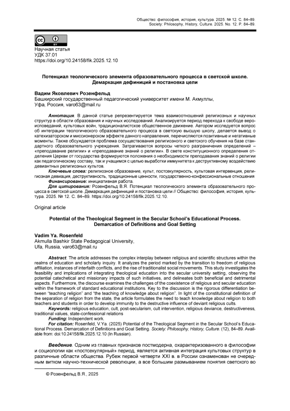 Текст научной статьи Потенциал теологического элемента образовательного процесса в светской школе. Демаркация дефиниций и постановка цели