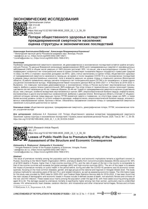 Проблема преждевременной смертности населения, её демографических и экономических последствий остаётся крайне актуальной для России. По данным Всемирной организации здравоохранения (ВОЗ) доля преждевременных смертей от неинфекционных заболеваний (НИЗ) в общем числе умерших от НИЗ россиян достигает 39%, что выше, чем в высокодоходных странах (27%), а коэффициент потерянных лет потенциальной жизни в стране соответствует показателю бедных государств и превышает средний по миру (на 49%) и странам с высокими доходами (на 85%). Цель статьи заключалась в оценке потерь общественного здоровья от преждевременной смертности населения в период до, во время и после пандемии COVID-19 и их экономических последствий в разрезе самых распространённых нозологий, пола и возраста умерших на уровне страны и отдельного региона (Вологодской области). В работе применялись методы расчёта потерянных лет потенциальной жизни (ПГПЖ) и их производных, а также оценки упущенной экономической выгоды. Информационной базой послужили данные ВОЗ за 2000–2021 гг. и Росстата за 2019–2022 гг. Выявлено, что главными причинами демографических и экономических потерь в России выступают неустановленные причины смерти, фиброз и цирроз печени (неалкогольный), ВИЧ-инфекция. При этом потери от перечисленных причин происходят преимущественно за счёт населения до 45 лет, главным образом, 30–44 лет. Ущерб от преждевременной смертности мужчин существенно выше, чем у женщин, особенно вследствие неустановленных причин, ВИЧ, атеросклеротической болезни сердца, инфаркта мозга, внутримозговых и других внутричерепных кровоизлияний, фиброза и цирроза печени. Вологодскую область отличает от общероссийской ситуации наличие среди ведущих причин ПГПЖ внезапной смерти и пневмонии, но отсутствие среди них ВИЧ, а также более высокий уровень потерь от острого инфаркта миокарда, инфаркта мозга, атеросклеротической болезни сердца, злокачественных новообразований трахеи, бронхов и лёгких. Обозначены направления снижения потерь от преждевременной смертности населения и улучшения диагностики их причин.