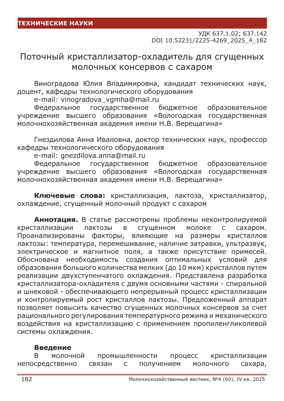 В статье рассмотрены проблемы неконтролируемой кристаллизации лактозы в сгущенном молоке с сахаром. Проанализированы факторы, влияющие на размеры кристаллов лактозы: температура, перемешивание, наличие затравки, ультразвук, электрическое и магнитное поля, а также присутствие примесей. Обоснована необходимость создания оптимальных условий для образования большого количества мелких (до 10 мкм) кристаллов путем реализации двухступенчатого охлаждения. Представлена разработка кристаллизатора-охладителя с двумя основными частями спиральной и шнековой обеспечивающего непрерывный процесс кристаллизации и контролируемый рост кристаллов лактозы. Предложенный аппарат позволяет повысить качество сгущенных молочных консервов за счет рационального регулирования температурного режима и механического воздействия на кристаллизацию с применением пропиленгликолевой системы охлаждения.