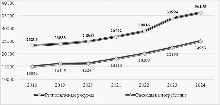 Рисунок 1. Располагаемые ресурсы и расходы на потребление домохозяйств с детьмив среднем на члена домохозяйства, руб. в месяц. Россия. 2018–2024 гг.4 5 6