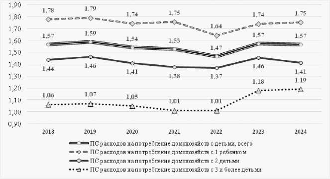 Одной из основных причин неоднозначного распределения прироста располагаемых ресурсов является разная у домохозяйств с детьми покупательная способность по расходам на потребление. Расчёты показывают, что в худшем положении находятся домохозяйства с 3 и более детьми. В рассматриваемом периоде при средней покупательной способности расходов на потребление 1,47–1,59 ПК ПМ она составляла у домохозяйства с 3 и более детьми всего 1,01–1,19 ПК ПМ, что характеризует их положение как близкое к состоянию бедности (ниже ПК ПМ) (рисунок 2). В отли- чие от них у домохозяйств с 1 ребёнком уровень показателя (1,64–1,79 ПК ПМ) был выше среднего уровня, а у домохозяйств с 2 детьми (1,37–1,46 ПК ПМ) – близким к среднему.