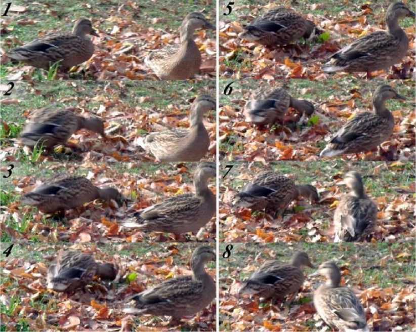 Наши наблюдения за кормёжкой кряквы желудями осенью на листовом опаде и анализ видеоклипов свидетельствуют, что птицы никогда не разбрасывают листья движениями клюва по сторонам от себя. Однако факт так называемого ворошения (раздвигания) листвы как вариант поискового зондирования присутствует. При этом птица сканирует поверхность почвы, поддевая листву клювом, но не разбрасывая её, а только раздвигая головой при движении утки в разных направлениях, или даже оставаясь на месте и вытягивая шею с периодическими уклонениями головы то вправо, то влево, совершая частые и не амплитудные движения клювом и головой из стороны в сторону, как мы понимаем, для увеличения ширины обследуемого трека и предварительного взрыхле- ния листового опада. Никакой явной преднамеренной предварительной визуализации кормовых объектов при этом нами не отмечено, что свидетельствует о том, что кряква использует только тактильные и, возможно, обонятельные анализаторы при поиске корма таким способом (рис. 1).