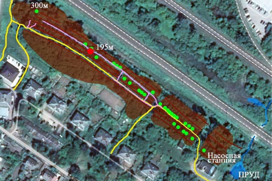 Рис. 4. Картосхема места исследований у насосной станции ливневой канализации в посёлке имени Крупской, Тверь. Условные обозначения: синий – пруд и ручей; жёлтый –тропы людей; коричневый – насаждения; зелёный – дубы