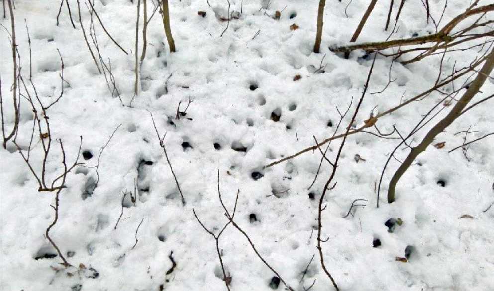 Поисковые и кормовые следы крякв вне зон проективных покрытий кронами дубов 23-24 декабря были обнаружены нами на двух участках. Не более 3 крякв пытались однократно кормиться под вязами рядом с основной кормовой площадкой в 195 м от пруда, а также на прогалке ивняка рядом с прудом, где остался их зигзагообразный поисковый след и следы глубокого зондирования. Возможно, здесь утки нашли какой-то другой корм (рис. 14).