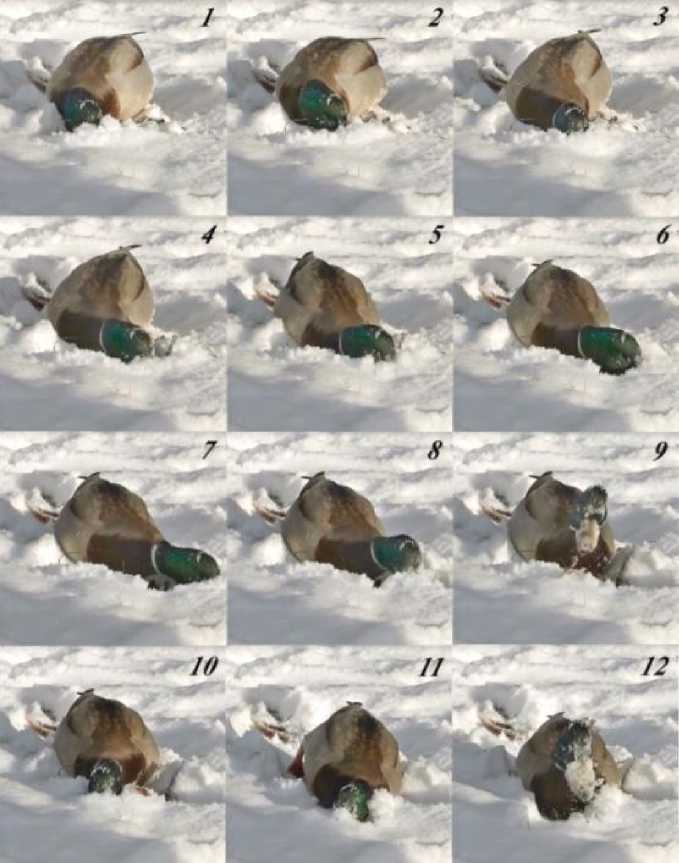Случаи кормёжки крякв желудями в снежный период наблюдали разные исследователи, но описания методов или только кормовых манёвров при их добыче из-под снега нам найти не удалось. Нам удалось найти только один видеоролик, из которого видно, что высота сплошного снежного покрова на месте кормёжки уток была не менее 5-6 см. Этот ролик снят в одном из парков Киева 11 февраля 2022 *. Действия уток при добывании желудей из-под неглубокого сухого рыхлого снега в морозную погоду мало чем отличаются от таковых при добывании ими желудей из листового опада и могут быть охарактеризованы как зондирование-вспашка (плужение, или бороздование) (рис. 1, 2).