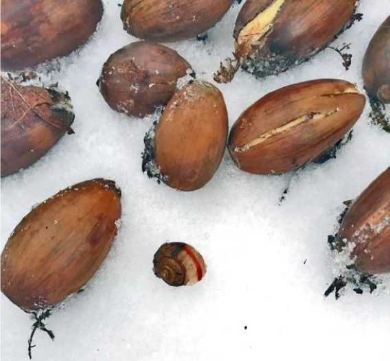 Рис. 5. Набухшие и прорастающие жёлуди с лопнувшей кожурой и живая кустарниковая улитка. Тверь.