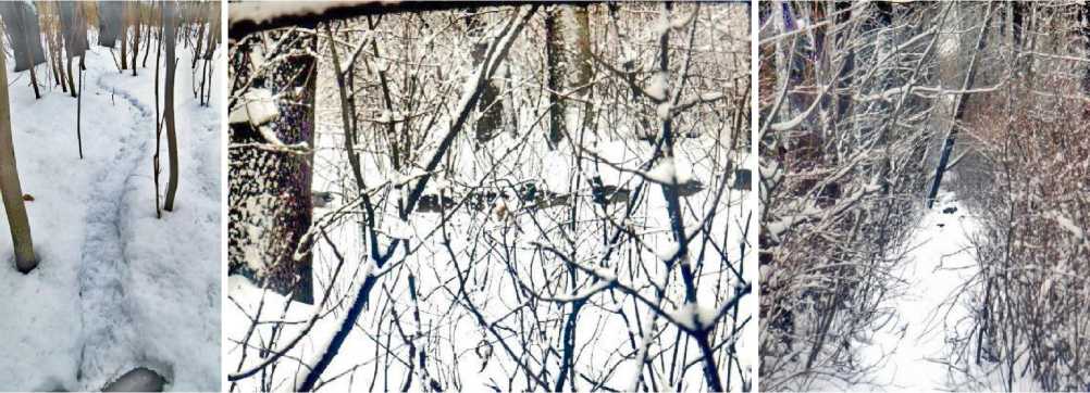 Другие кряквы взлетали с берега пруда. Приземлялись они на тро -пе, протоптанной людьми, или собственной тропинке на просеке, на свободных от густой древесно-кустарниковой растительности участках насаждений, иной раз в нескольких десятках метров от места кормёжки, и следовали к нему уже пешком по тропам. Пройдя по тропе, протоптанной людьми, утки сворачивали с неё перпендикулярно по утиной тропинке сквозь подлесок и достигали сразу кормовой площадки, либо доходили до просеки вдоль лесополосы, где подлеска не было. Здесь по ранее сформированной утиной тропе они передвигались плотно друг за другом до другой кормовой площадки (рис. 8). Во время поиска корма кряквы использовались два варианта зондирования снега: ориентиро- вочное поисковое зондирование (jabbing), а при обнаружении пищевых объектов – глубокое кормовое зондирование (probing) (рис. 9, 10).