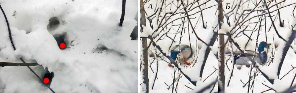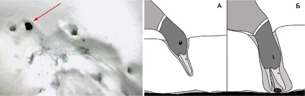 Рис. 12 (справа). Кормёжка селезня желудями из-под глубокого снега, «А» – зондирование (probing), «Б» – манипулирование. Коллаж А.Виноградова из видео В.Рыбакова
