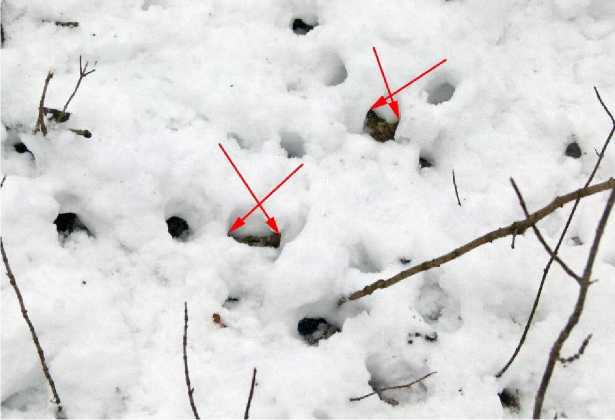 Наблюдения за кряквами были продолжены 23, 26 декабря и 6 января. Глубина снежного покрова в эти дни достигала 25-26 см, местами до 31 см. Птиц непосредственно в насаждениях мы не наблюдали, а об их активности здесь можно было судить только по следам. Утки совсем не кормились в насаждениях 22 декабря по неясным причинам. Судя по следам, насаждения посещались утками только в светлое время суток. Кряквы продолжали кормиться на уже освоенной кормовой площадке до 25 декабря, удлинив её вдоль просеки на 2 м в сторону пруда и на 1 м в противоположную сторону, но не расширили её из-за густой древесной поросли по периферии с высокими намётами снега.