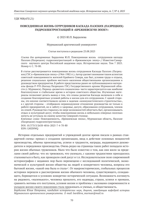 В статье рассматривается повседневная жизнь сотрудников Каскада Пазских (Пазрецких) ГЭС в «брежневскую эпоху» (1964-1982 гг.). Автор уделяет внимание таким аспектам советской повседневности жителей Крайнего Севера, как быт, условия труда и отдыха, решение социальных проблем местного населения общественными организациями и руководством предприятия. В работе представлены ранее не публиковавшиеся материалы фонда Р-970 (Каскад Пазрецких ГЭС) Государственного архива Мурманской области (г. Мурманск). Период «развитого социализма» часто характеризуется как наиболее благополучное и стабильное время в истории советского общества. Изученные материалы позволяют делать вывод о том, что планы развития Каскада включали в себя и создание благоприятных условий работы и жизни для его сотрудников. С одной стороны, это вполне соответствовало целям и задачам «коммунистического строительства», а с другой стороны – отображало неравнодушное отношение руководства не только к работе предприятий, но и заботу о здоровье, досуге, образовании сотрудников, членов их семей. Руководство старалось по мере возможностей облегчать быт, организовывать отдых и культурный досуг, чтобы повседневная жизнь в небольших северных поселках ничуть не уступала по своему качеству Северной столице.