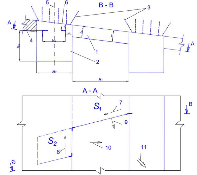 В последующем испытанный вариант очистной выемки разработки был усовершенствован и дополнен другим техническим решением. В нем предусматривалось использовать комбинирование селективного и валового способов очистной выемки на базе конструктивного элемента системы разработки как парные заходки (рис.). На рисунке показана схема выемки балансовых запасов в очистной выработке парными заходками: 1, 2 – первая и вторая заходки в парной заходке соответственно; 3 – анкерная крепь; 4 – рудная залежь; 5 – ось выработки; 6 – контур технологического оборудования; 7, 8 – направление бурения в парной заходке соответственно в первой и второй заходках; 9, 10 – направление перемещения отбитой рудной массы энергией взрыва соответственно из первой и второй заходок; 11 – общее направление перемещения отбитой рудной массы энергией взрыва из парной заходки в смежную; S 1 , S 2 – отбиваемая за цикл площадь рудной залежи в первой и второй заходках соответственно, м2; B 1 = lск ·cosα – ширина первой заходки, м; lСК – длина скважины малого диаметра в первой заходке, м; α – угол падения рудной залежи, град; B 2 = bто + 2Δ b – ширина второй заходки; bто – ширина самоходного технологического оборудования (СТО); Δ b – минимальный размер зазоров между стенками траншеи и вертикальной плоскостью максимально выступающей части СТО; h то – высота СТО, м; Δ h – минимальный размер зазоров между кровлей и горизонтальной плоскостью максимально выступающей части СТО, м.