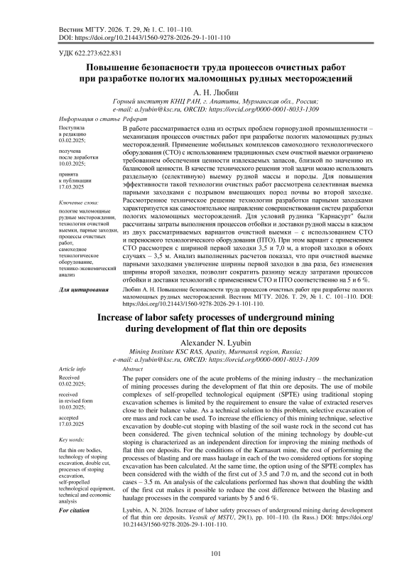 Любин А. Н. Повышение безопасности труда процессов очистных работ при разработке пологих маломощных рудных месторождений. Вестник МГТУ. 2026. Т. 29, № 1. С. 101–110. DOI: