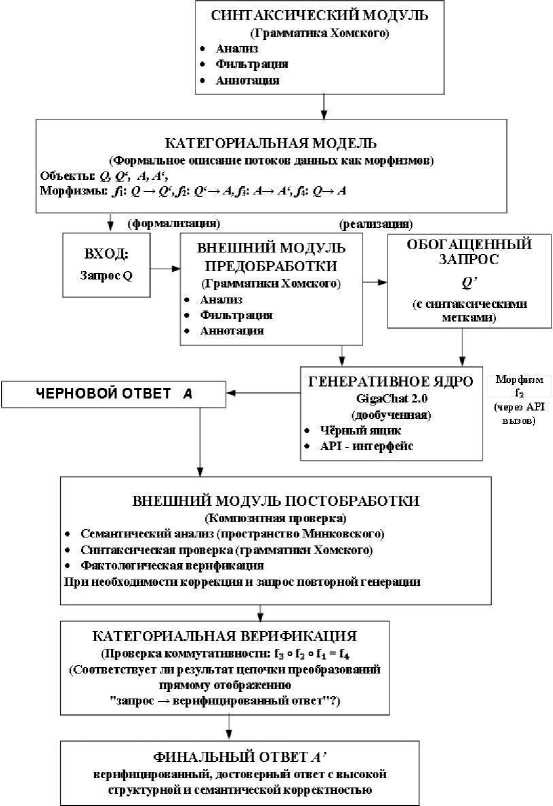 Такие модели, предобученные на корпусах текстов, научились генерировать связные, грамматически правильные и контекстуально уместные ответы. Категориальная модель системы с внешним контролем (см. рисунок 1) оперирует четырьмя ключевыми объектами: Q (исходный запрос), Q' (запрос, обогащённый синтаксическими аннотациями), A (черновой ответ генеративной модели) и A' (финальный верифицированный ответ).