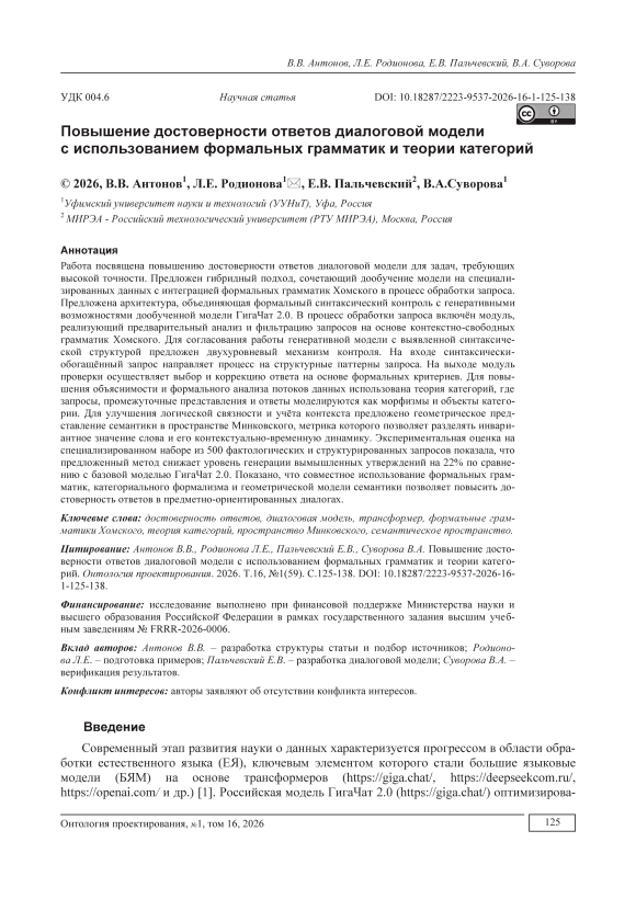 Работа посвящена повышению достоверности ответов диалоговой модели для задач, требующих высокой точности. Предложен гибридный подход, сочетающий дообучение модели на специализированных данных с интеграцией формальных грамматик Хомского в процесс обработки запроса. Предложена архитектура, объединяющая формальный синтаксический контроль с генеративными возможностями дообученной модели ГигаЧат 2.0. В процесс обработки запроса включѐн модуль, реализующий предварительный анализ и фильтрацию запросов на основе контекстно-свободных грамматик Хомского. Для согласования работы генеративной модели с выявленной синтаксической структурой предложен двухуровневый механизм контроля. На входе синтаксическиобогащѐнный запрос направляет процесс на структурные паттерны запроса. На выходе модуль проверки осуществляет выбор и коррекцию ответа на основе формальных критериев. Для повышения объяснимости и формального анализа потоков данных использована теория категорий, где запросы, промежуточные представления и ответы моделируются как морфизмы и объекты категории. Для улучшения логической связности и учѐта контекста предложено геометрическое представление семантики в пространстве Минковского, метрика которого позволяет разделять инвариантное значение слова и его контекстуально-временную динамику. Экспериментальная оценка на специализированном наборе из 500 фактологических и структурированных запросов показала, что предложенный метод снижает уровень генерации вымышленных утверждений на 22% по сравнению с базовой моделью ГигаЧат 2.0. Показано, что совместное использование формальных грамматик, категориального формализма и геометрической модели семантики позволяет повысить достоверность ответов в предметно-ориентированных диалогах.
