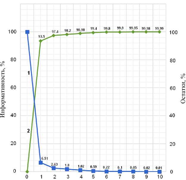 Рис. 1. Дисперсия остатков (кривая 1) и информативность преобразованных данных (кривая 2) Fig. 1. Dispersion of residuals (curve 1) and information content of transformed data (curve 2)