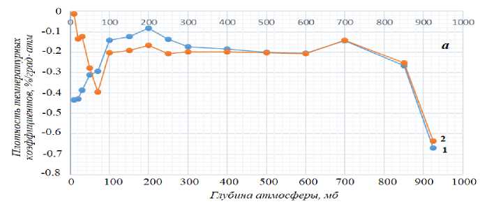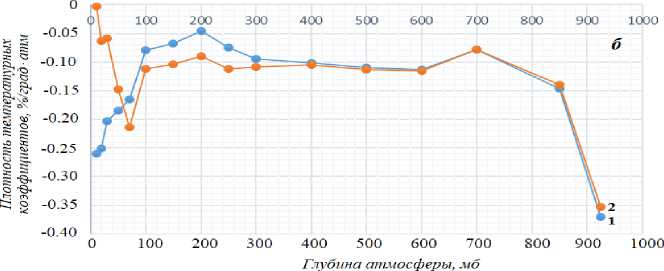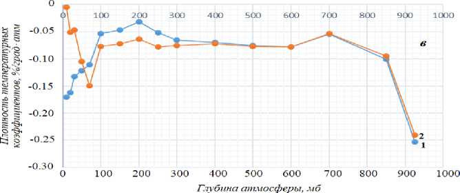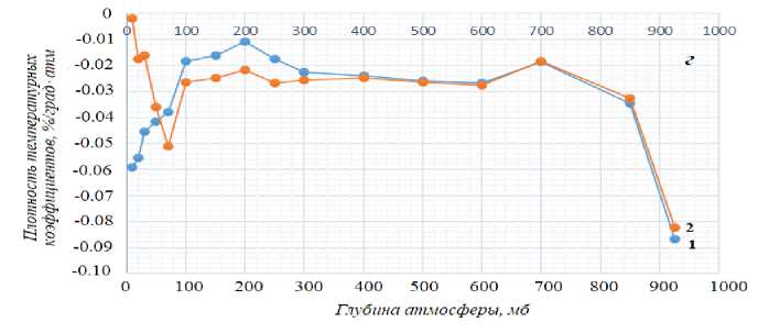 Рис. 2. Распределение плотности температурных коэффициентов для мюонов, регистрируемых на поверхности ( а ) и глубине 7 ( б ), 20 ( в ) и 40 м.в.э. ( г ) с вертикальных направлений, найденные методами ПЛС с привлечением одной (кривая 1) и двух (кривая 2) главных компонент