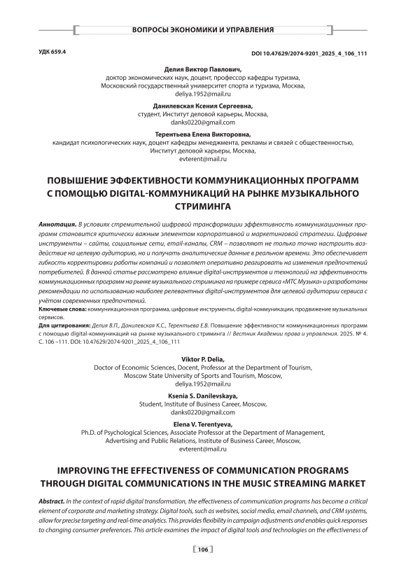 В условиях стремительной цифровой трансформации эффективность коммуникационных программ становится критически важным элементом корпоративной и маркетинговой стратегии. Цифровые инструменты – сайты, социальные сети, email-каналы, CRM – позволяют не только точно настроить воздействие на целевую аудиторию, но и получать аналитические данные в реальном времени. Это обеспечивает гибкость корректировки работы компаний и позволяет оперативно реагировать на изменения предпочтений потребителей. В данной статье рассмотрено влияние digital-инструментов и технологий на эффективность коммуникационных программ на рынке музыкального стриминга на примере сервиса «МТС Музыка» и разработаны рекомендации по использованию наиболее релевантных digital-инструментов для целевой аудитории сервиса с учётом современных предпочтений.