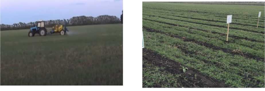 Почва опытного участка – чернозем выщелоченный. Испытания проводились на озимой пшенице с внесением ЖМУ при помощи опрыскивателя «Заря» с шириной захвата 21м и трактора Беларус 82.1 (Рисунок 3, а).