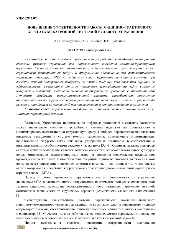 Целью исследования является повышение эффективности выполнения 226 Агротехника и энергообеспечение. – 2025. – № 4 (49)