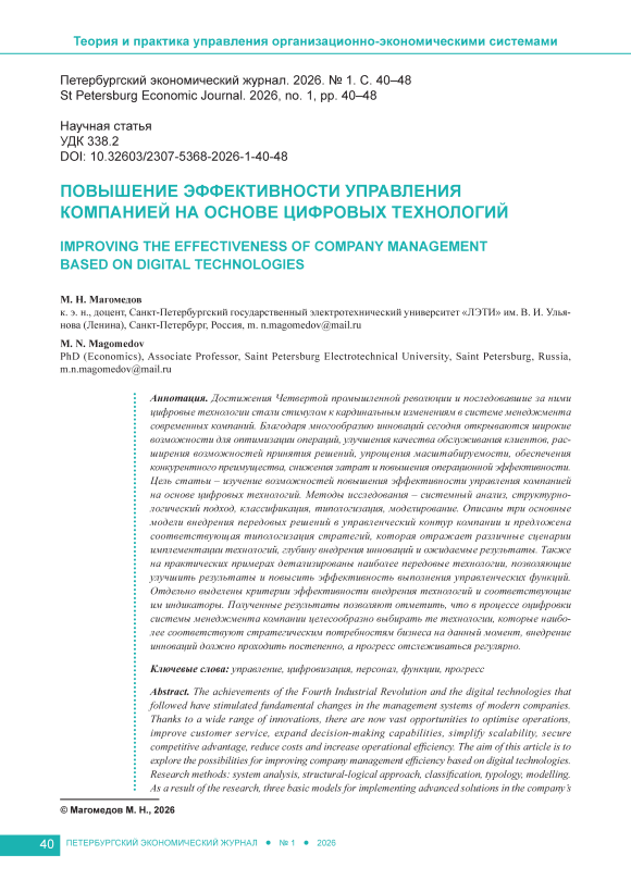 Достижения Четвертой промышленной революции и последовавшие за ними цифровые технологии стали стимулом к кардинальным изменениям в системе менеджмента современных компаний. Благодаря многообразию инноваций сегодня открываются широкие возможности для оптимизации операций, улучшения качества обслуживания клиентов, расширения возможностей принятия решений, упрощения масштабируемости, обеспечения конкурентного преимущества, снижения затрат и повышения операционной эффективности. Цель статьи – изучение возможностей повышения эффективности управления компанией на основе цифровых технологий. Методы исследования – системный анализ, структурно-логический подход, классификация, типологизация, моделирование. Описаны три основные модели внедрения передовых решений в управленческий контур компании и предложена соответствующая типологизация стратегий, которая отражает различные сценарии имплементации технологий, глубину внедрения инноваций и ожидаемые результаты. Также на практических примерах детализированы наиболее передовые технологии, позволяющие улучшить результаты и повысить эффективность выполнения управленческих функций. Отдельно выделены критерии эффективности внедрения технологий и соответствующие им индикаторы. Полученные результаты позволяют отметить, что в процессе оцифровки системы менеджмента компании целесообразно выбирать те технологии, которые наиболее соответствуют стратегическим потребностям бизнеса на данный момент, внедрение инноваций должно проходить постепенно, а прогресс отслеживаться регулярно.