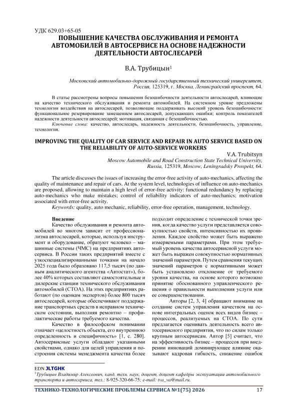 В статье рассмотрены вопросы повышения безошибочности деятельности автослесарей, влияющие на качество технического обслуживания и ремонта автомобилей. На системном уровне предложены технологии воздействия на автослесарей, позволяющие поддерживать высокий уровень безошибочности: функциональное резервирование замещением автослесарей, допускающих ошибки; контроль показателей надежности деятельности автослесарей; мотивация, связанная с безошибочностью.